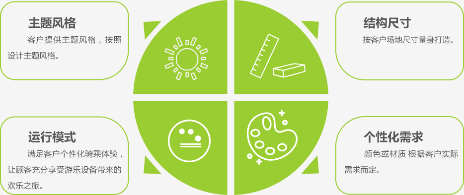 龍之盈不僅能設(shè)計制造標準型游樂設(shè)備,也能提供個性化設(shè)備的設(shè)計方案及制造產(chǎn)品以滿足客戶多樣化主題產(chǎn)品需求。為此,龍之盈游樂特設(shè)定制服務(wù),明確客戶需求并制定出解決方案,從產(chǎn)品的設(shè)計制造到安裝運營,最大限度的滿足客戶需求。