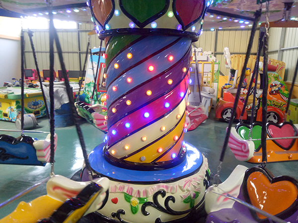 兒童游樂設備七彩小飛椅顯得小巧、卡通,在設備的*低端有一個固定的托盤,托盤上面是用來支撐飛椅的支架,在支架上面安裝設計了卡通圖案和彩色的燈光,支架最頂端也是帶有卡通圖案和彩色燈光的可以旋轉的轉盤,轉盤上面鏈接著鎖鏈而鎖鏈鏈接著飛椅。