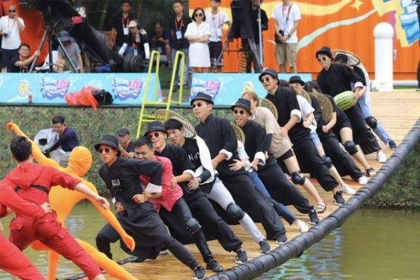 兩撥人站在搖擺橋上,由慢而快的來(lái)回?cái)[動(dòng),平衡力差的將會(huì)落入水中,這一好玩的游樂(lè)項(xiàng)目一經(jīng)開(kāi)始,便火爆的不得了。